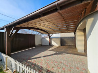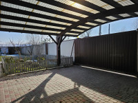 Перед гаражом – красивый деревянный навес на 2 авто (6*6 м), накрыт ударопрочным, не пропускающим ультрафиолет поликарбонатом. Въезд – откатные ворота с электроприводом, дистанционный пульт управления.